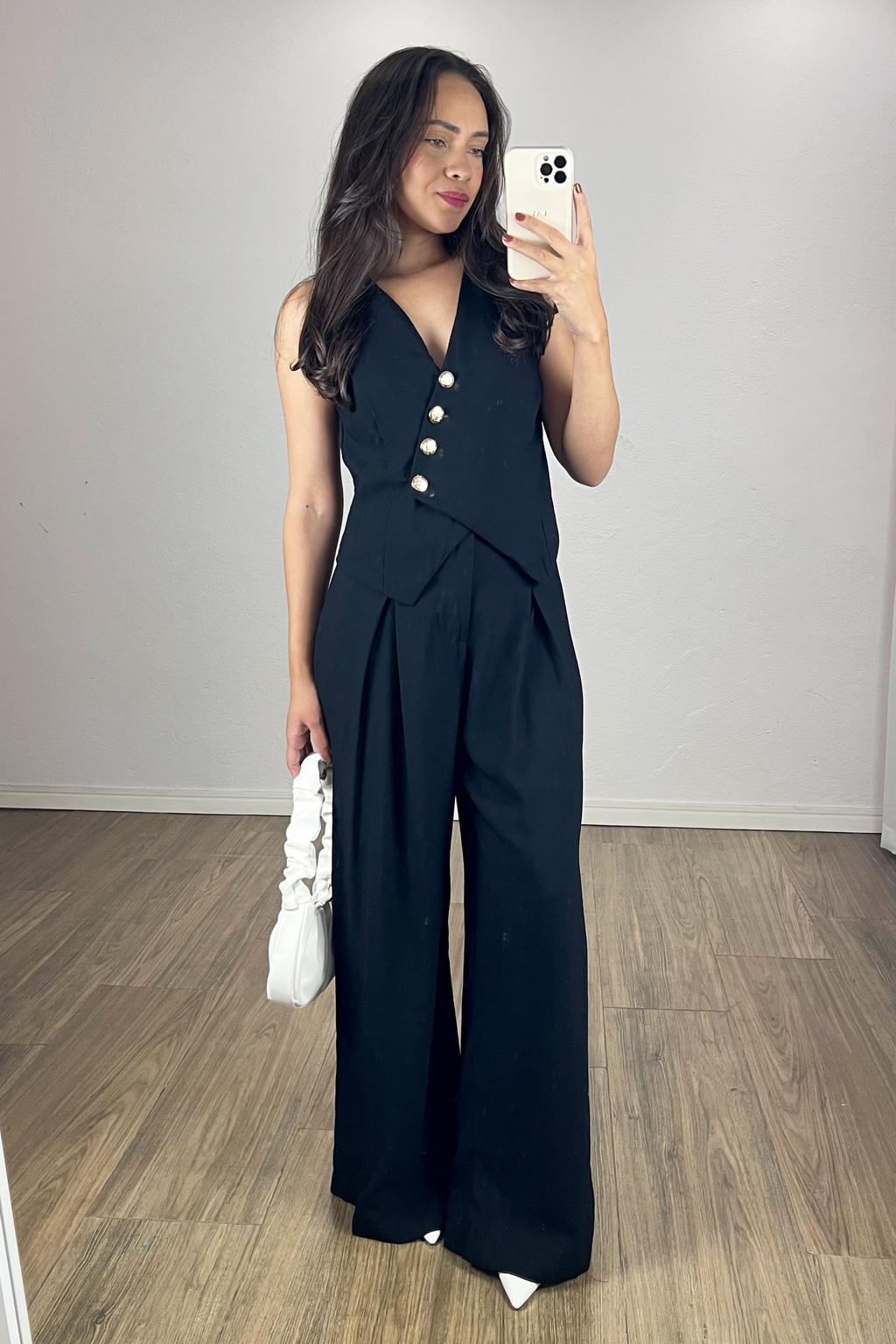 Conjunto em viscose sarjada, composto por pantalona com pregas na frente, e colete decote V com fechamento na diagonal, por botões dourados com brasão, que dão um toque refinado e estiloso as peças. Ele é super elegante e atemporal, ideal pra compor looks tanto formais quanto casuais.