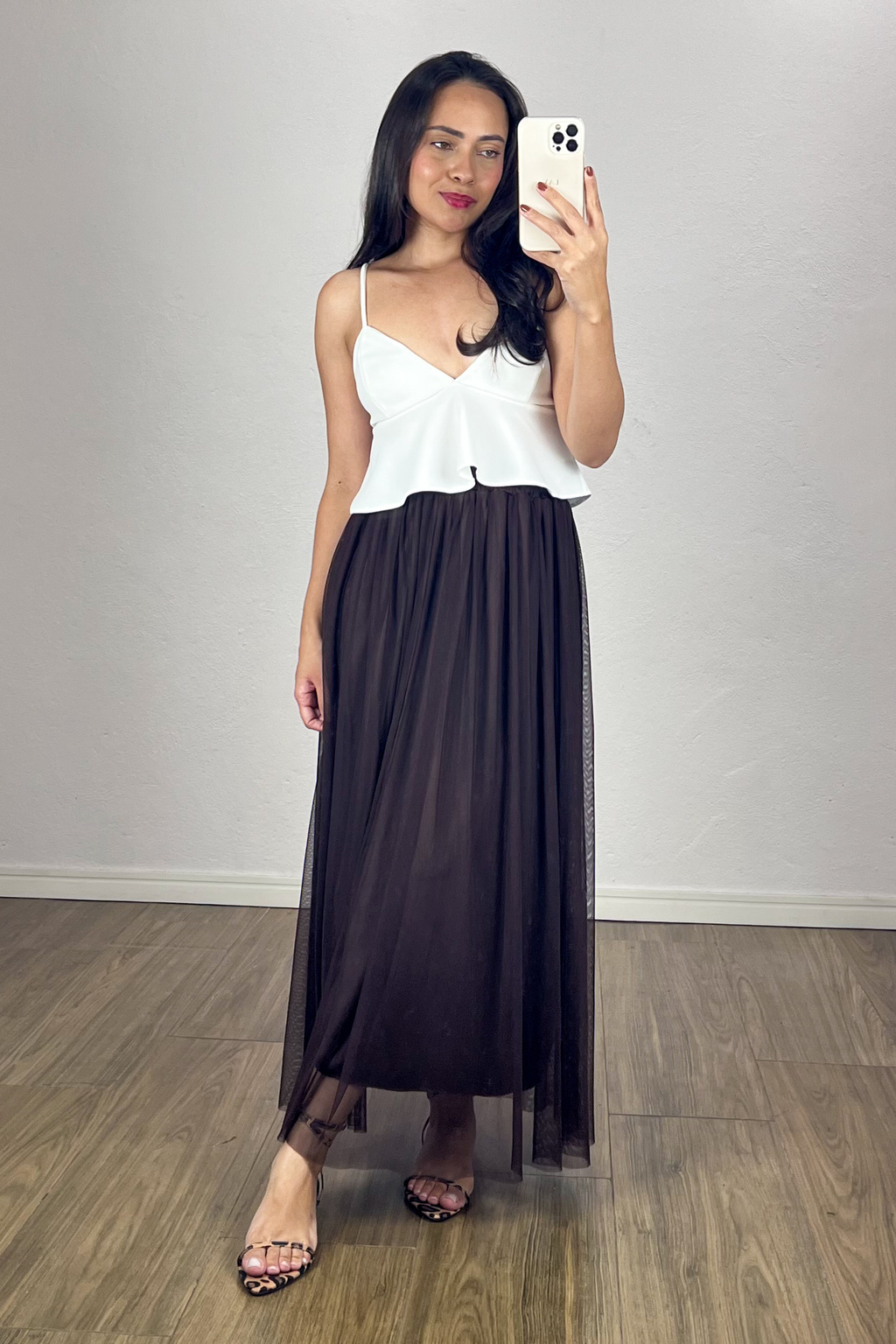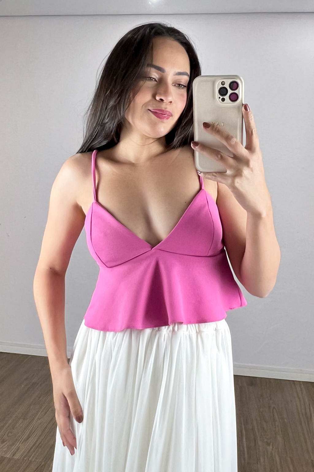 Cropped de alcinha confeccionado no crepe scuba, com decote V, e detalhe de bababo na barra, que dá um toque de leveza e feminilidade ao look. Com ele você consegue ciar diversos looks, do básico ao elegante. Combine com uma wide leg jeans, calça mom e tenis pra um look casual. Saia midi, pantalona e salto para um look elegante, ou saia ou short de couro, acessórios e um blazer por cima, para um visual sexy.